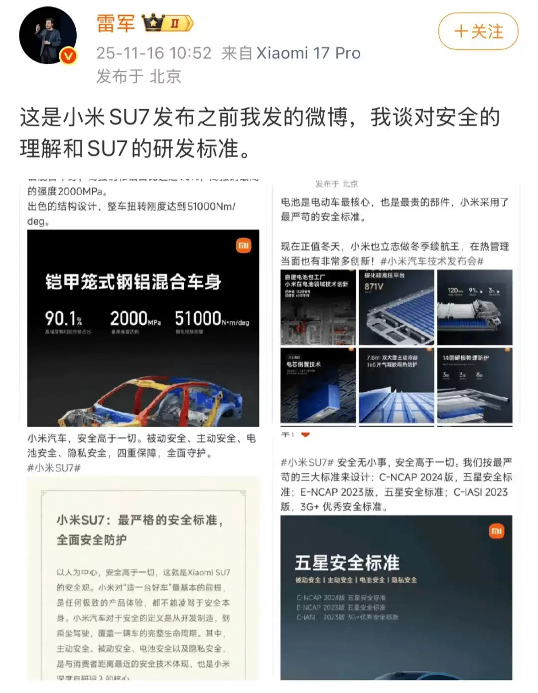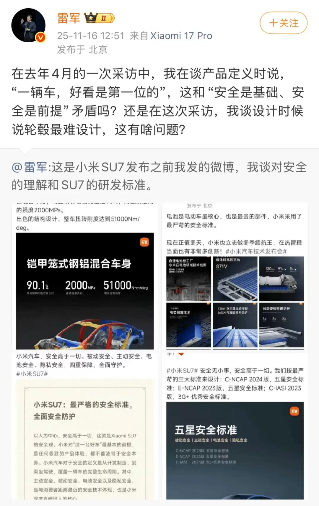 11月16日上午10点52分,雷军通过个人微博回应称,外界热议的内容其实是去年小米SU7上市前他对安全理念的阐述,以及产品研发时的标准设定。他明确指出,小米汽车始终将安全性能作为最关键的要素之一,绝不会因为追求造型美观而放松对安全品质的把控。随后的11点25分,他再次转发这条微博并补充说,这些观点形成于2023年底至2024年初之间,是他向团队强调产品整体设计思路时的表达。