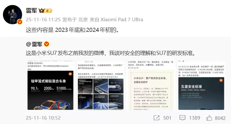 这场讨论的起因,是部分网友对雷军过往采访言论的片面解读。雷军在澄清时指出,自己虽然提过"车辆设计需兼顾美观与实用性",但这并不意味着将外观置于安全之上。他还公开了2022年至2024年间发布的四则微博截图,内容涉及小米汽车研发阶段的安全标准制定过程。其中2023年12月28日的动态显示,小米SU7采用钢铝混合车身结构,高强度钢材与铝合金占比超90%,关键部位最高强度达2000MPa,整车扭转刚度达51000Nm/deg。而2024年1月3日的微博则明确提出"安全高于一切"的研发原则,涵盖被动安全、主动安全、电池安全及隐私安全四大维度。