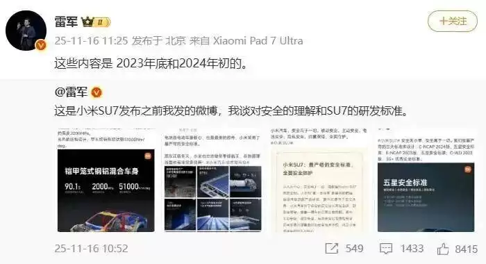 小米汽车安全至上,雷军发博澄清设计与安全不冲突