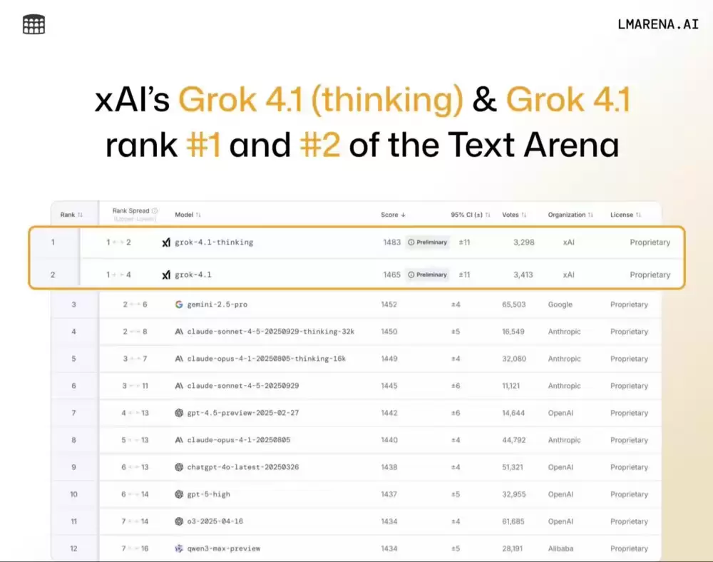 Grok 4.1的性能表现已达到业界顶尖水准。在大型语言模型竞技场(LMArena)的文本能力排行榜中,其具备深度思考能力的版本(代号:quasarflux)以1483的Elo分数高居榜首,领先第二名达31分。