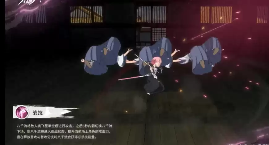 施展战术技能后,草鹿八千流会先将目标挑空并追加一次强力斩击。此技能的核心价值并非单纯输出,而在于触发后台增益机制。建议在技能释放后的3秒内迅速切换角色下场,一旦进入观战状态,即可为当前出战队友提供攻击力加成。此外,在队友使用普攻或分支攻击时,草鹿八千流还能持续积攒必杀技能量,实现资源循环。