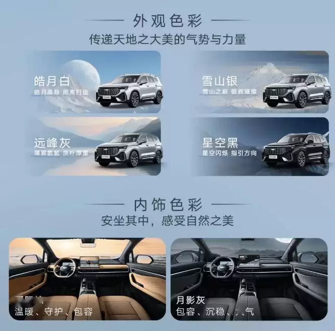 外观方面,第三代豪越L采用“天地美学”设计理念,前脸配备全新“百川归流前格栅”,配合4865mm的车身长度,营造出大气沉稳的视觉冲击。车身提供皓月白、雪山银、远峰灰、星空黑四种配色方案,满足不同用户的个性化需求。侧面线条流畅自然,悬浮式车顶设计进一步提升了整车的时尚气质。