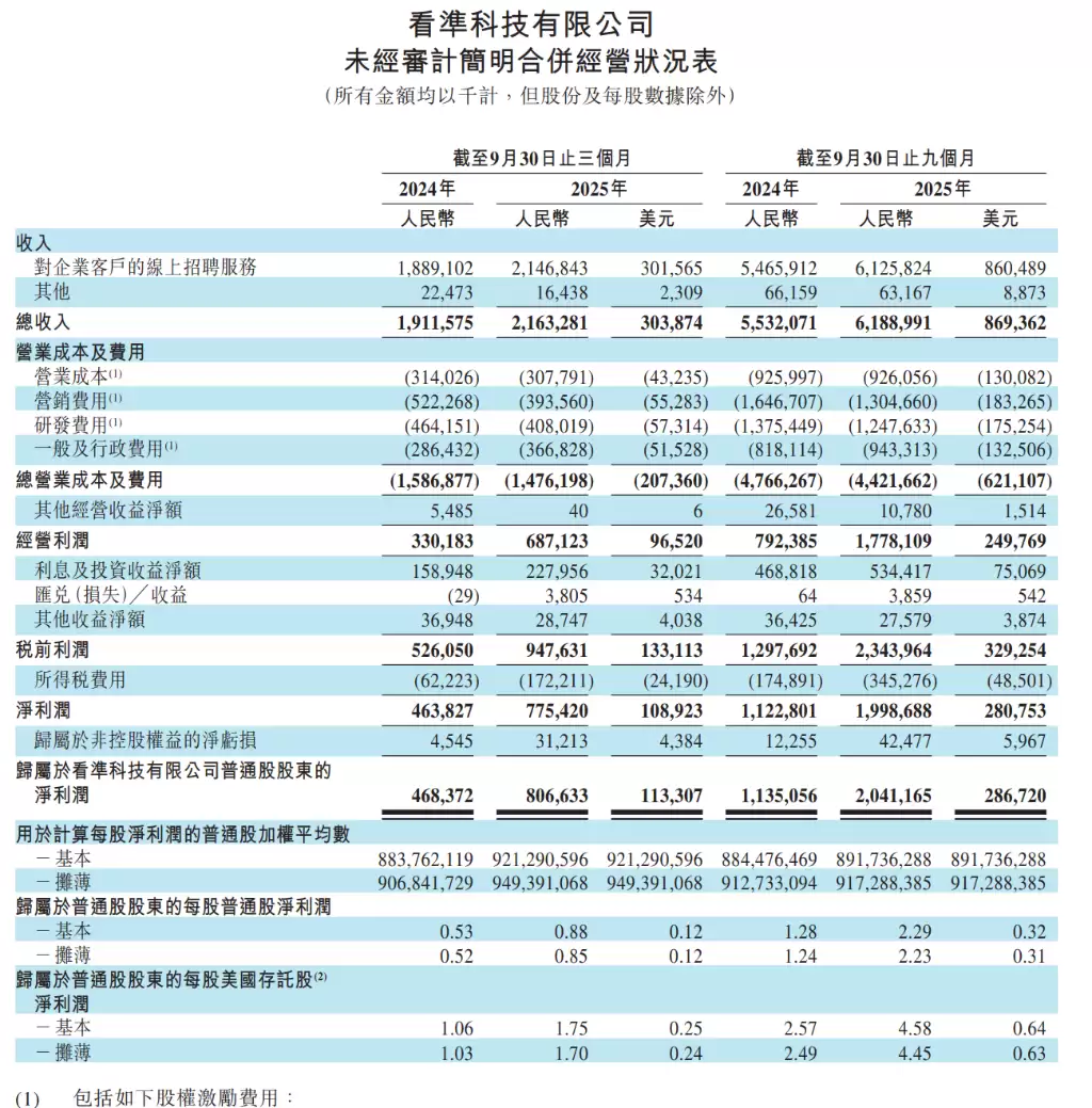 11月18日,在线招聘平台BOSS直聘(看准科技)公布了2025年第三季度财务报告: