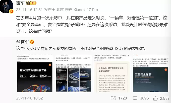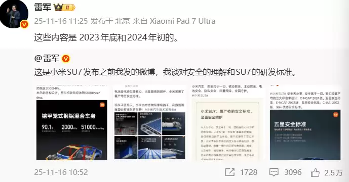 争议的导火索源于雷军此前关于产品设计的公开表态。他强调,去年4月采访中提及"车辆外观重要性"的言论,与"安全是基础"的企业原则并不冲突。针对轮毂设计难度的讨论,雷军解释这属于技术层面的专业观点,却被部分网友刻意曲解。为澄清不实信息,他特意晒出四张历史微博截图,其中2024年12月28日的发文明确指出:"电池作为电动车最核心部件,小米采用了行业最严苛的安全标准。"