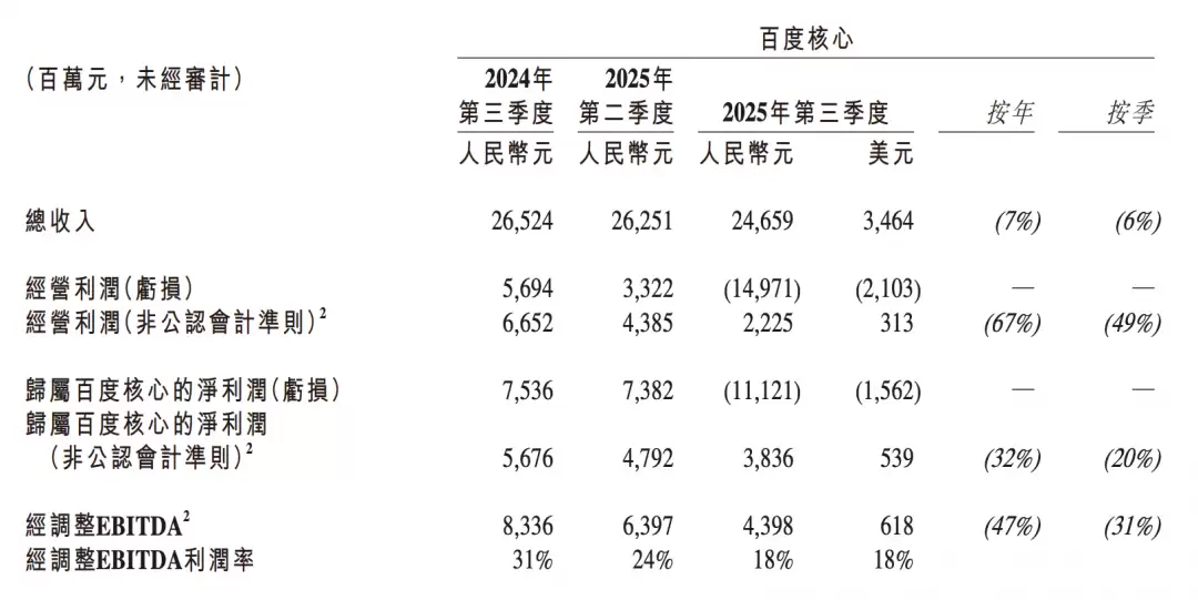 根据百度最新发布的2025年第三季度财报数据,公司总营收达到312亿元人民币(约合43.8亿美元),与去年同期相比下滑7%,环比亦减少5%。受162亿元(约22.7亿美元)长期资产减值拖累,本季度经营亏损151亿元(约21.2亿美元),净亏损112亿元(约15.8亿美元)。若剔除此减值因素影响,在非公认会计准则下的经营利润为22亿元(约3.1亿美元),净利润达38亿元(约5.3亿美元),核心业务仍保持盈利状态。