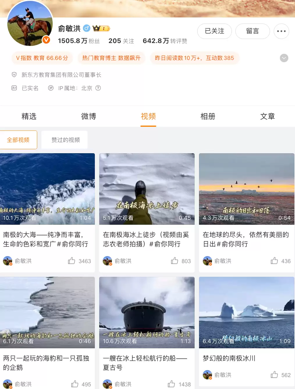 此前报道显示,11月16日适逢新东方成立32周年纪念日,正在南极考察的俞敏洪向员工发送了一封内部信。信中17次提及"我"和5次提到"南极",却对员工当前面临的工作压力只字未提。不少员工看到后纷纷吐槽:"你在南极看企鹅,我在岗位当牛做马"。在员工热议后,11月18日,俞敏洪在社交平台连续发布了10条南极游历的视频片段。
