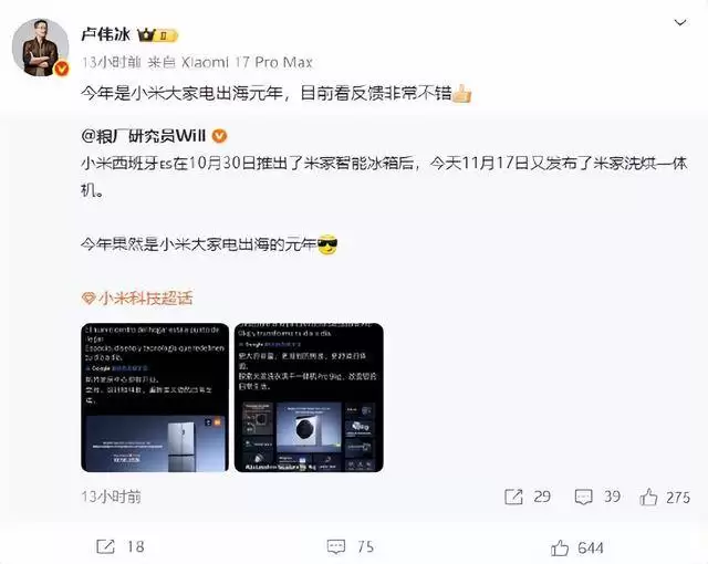 小米集团持续发力海外市场,近日在西班牙接连推出两款智能家电新品,这一动向引发了行业内的广泛关注。11月17日,小米正式发布了米家洗烘一体机,这是继10月30日推出米家智能冰箱后,品牌在西班牙市场投放的又一重量级产品。小米集团合伙人、总裁卢伟冰通过社交媒体分享了相关动态,并透露今年是小米智能家电业务拓展海外市场的关键一年,目前所获得的市场反响远超预期。