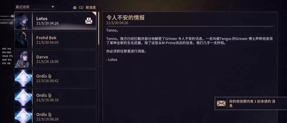 在游戏中,悲剧的开端这个任务让不少玩家感到困扰,常常不知道该怎样推进剧情,导致整个主线任务停滞不前,游戏体验大打折扣。其实触发任务流程非常简单:当我们完成当前的主线任务后,返回自己的飞船时,会注意到邮箱里收到一封来自Lotus的信件,标题为“令人不安的情报”。阅读完这封情报后,整个任务就会正式启动。接下来我们只需要跟随剧情引导找到Lotus接取任务,顺着指示行动即可。