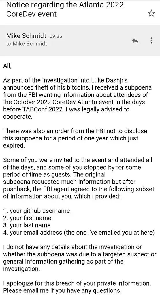 据报道,比特币非营利组织Brink的共同创办人Mike Schmidt收到FBI传票,要求他提供2022年10月CoreDev聚会参与者的信息,协助调查Luke Dashjr的被盗事件。Schmidt的法律顾问建议他配合调查,因此他已经向FBI提供了与会者的姓名、GitHub用户名和电子邮件地址。