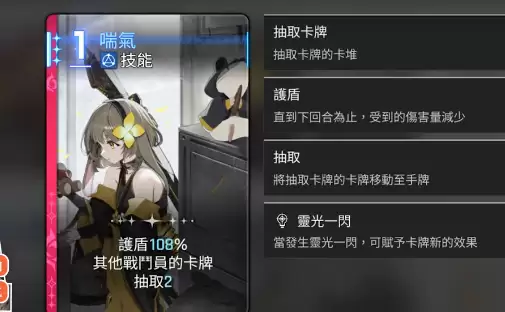 接下来我们看看通过灵光一闪获取的卡牌。喘气在一费时就能提供100%的护盾,并且还能抽取其他两名战斗员。不论是高速卡组还是低速卡组,这都是相当强力的抽卡效果,可以精准地抽到一些关键牌。在灵光一闪的衍生形态中,比较常用的是衍生一,而衍生二更侧重于自身的输出能力。衍生三则属于零费的上盾效果,但稳定性相对较差。最后要介绍的是准备发射的搭档卡——准备轰炸。这张卡能有效提升上膛的上限,在高速卡组中能进一步强化输出。很多人喜欢将这个角色与百丽儿放在一起对比,其实这个角色真正擅长的是补充伤害,而且不会占用过多资源,因此适配性非常出色。