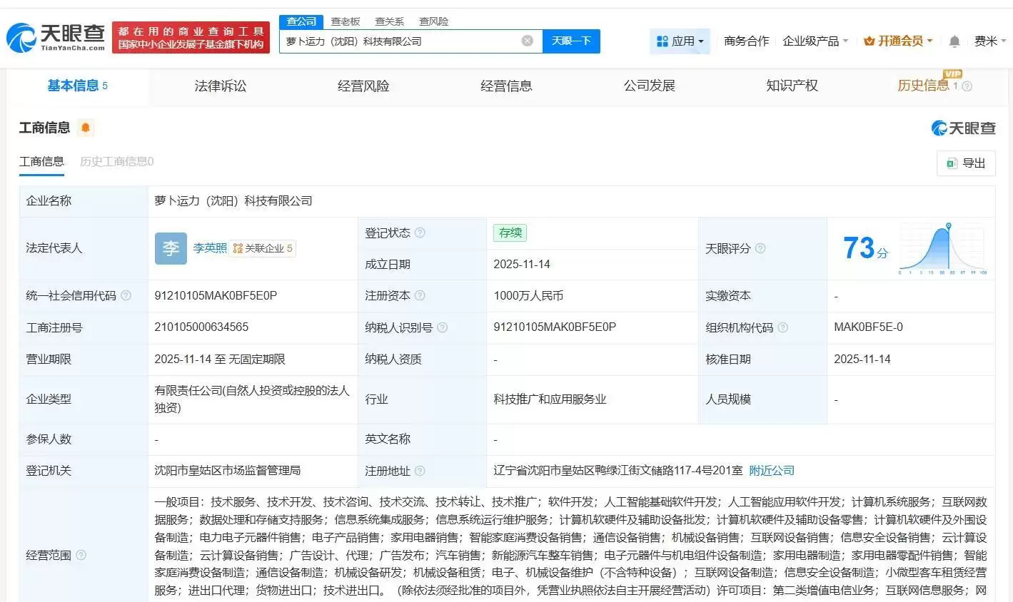 根据工商信息平台天眼查最新披露的信息显示,一家名为萝卜运力(沈阳)科技有限公司的新企业已经完成注册登记。该公司的法定代表人是李英照,注册资本高达1000万元人民币,业务范围涵盖了人工智能基础与应用软件开发、计算机系统服务等多个科技领域。