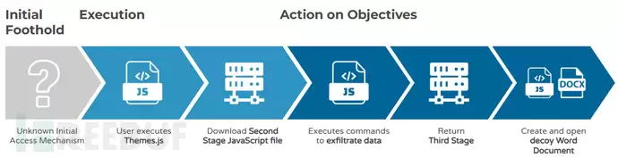 研究还发现Kimsuky在近期行动中使用的新型基于JavaScript的恶意软件投放器,显示该组织在持续升级其恶意武器库。攻击始于初始JavaScript文件(“themes.js”),该文件会联系攻击者控制的基础设施以获取更多能执行命令、窃取数据的JavaScript代码。