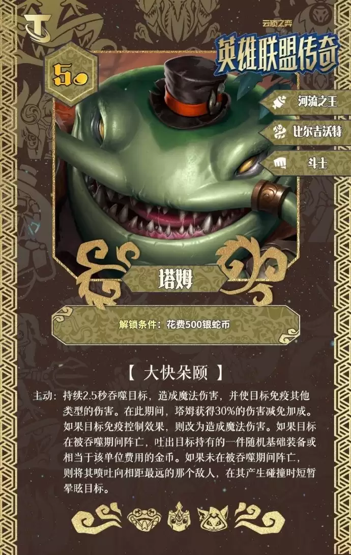 主动:在2.5秒内持续吞噬目标,造成魔法伤害的同时使目标免疫其他类型伤害。吞噬期间,塔姆获得30%的伤害减免加成。若目标免疫控制效果,则改为直接造成魔法伤害。若目标在被吞噬期间阵亡,会随机吐出一件该单位持有的基础装备或等值金币。如果目标未被吞噬致死,则会将其喷向距离最远的敌人,碰撞时对目标造成短暂眩晕。