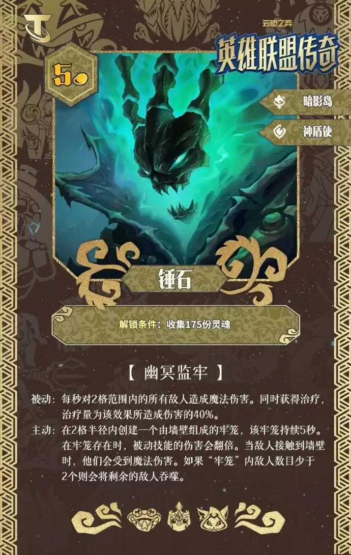 主动:在2.5格半径范围内创建一个由墙壁构成的牢笼,持续5秒。牢笼存在期间,被动技能的伤害会大幅提升。敌人触碰到墙壁时将受到魔法伤害。若牢笼内的敌人数量少于2名,则会吞噬剩余敌人。