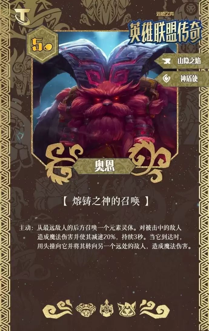 主动:从距离最远的敌人身后召唤一个元素灵体。被击中的敌人会受到魔法伤害并被减速20%,持续3秒。当灵体抵达目标位置时,奥恩会用头将其撞向另一名远处的敌人,再次造成魔法伤害。