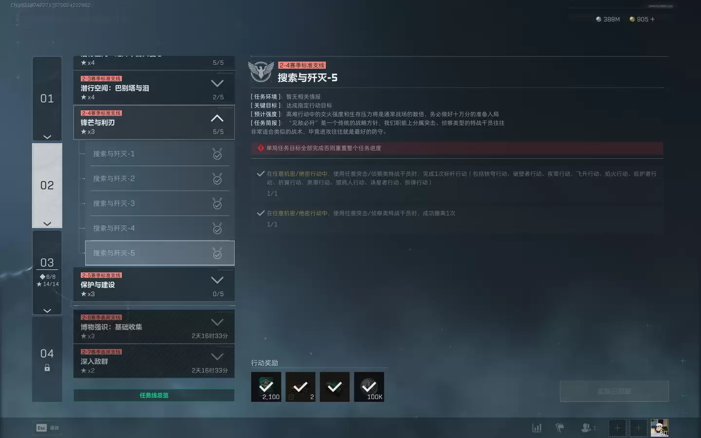 2、在任意机密/绝密行动中,使用突袭/侦察类特战干员时,成功撤离1次