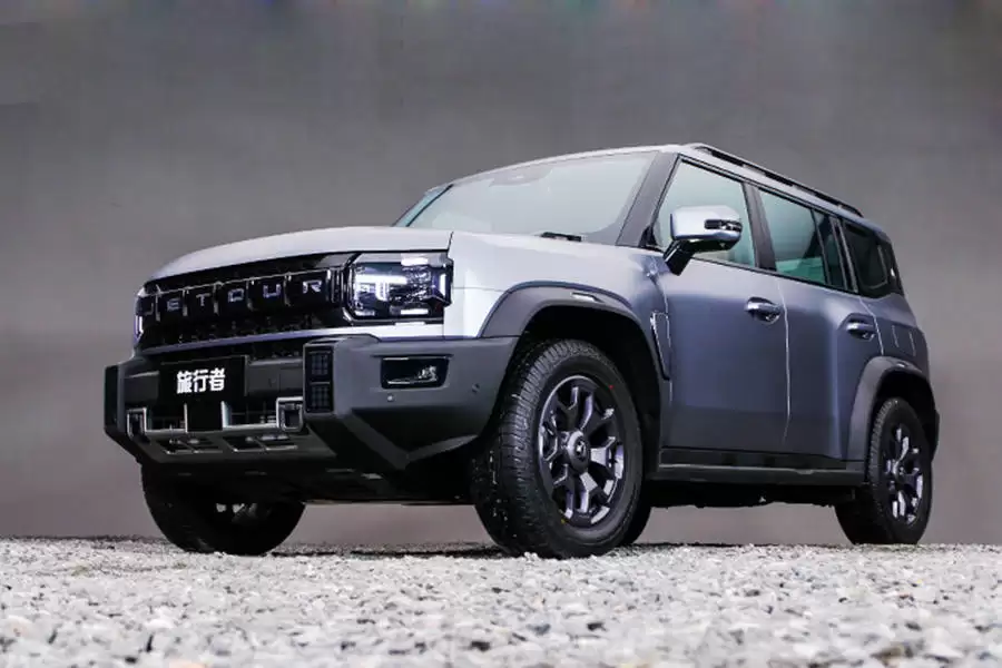 外观设计上,新款车型与现款车型高度一致,依然采用硬朗的方盒子造型,贴合目标消费群体的审美偏好。前脸部分,前格栅与两侧大灯组采用一体化设计,下方前包围两侧配有小型雾灯组,中央区域则采用银色下护板并预留了拖车锚点。车身侧面线条简洁流畅,顶部配有行李架,车尾部分方正造型的尾灯搭配“小书包”式备胎设计,进一步强化了整车的硬派风格。