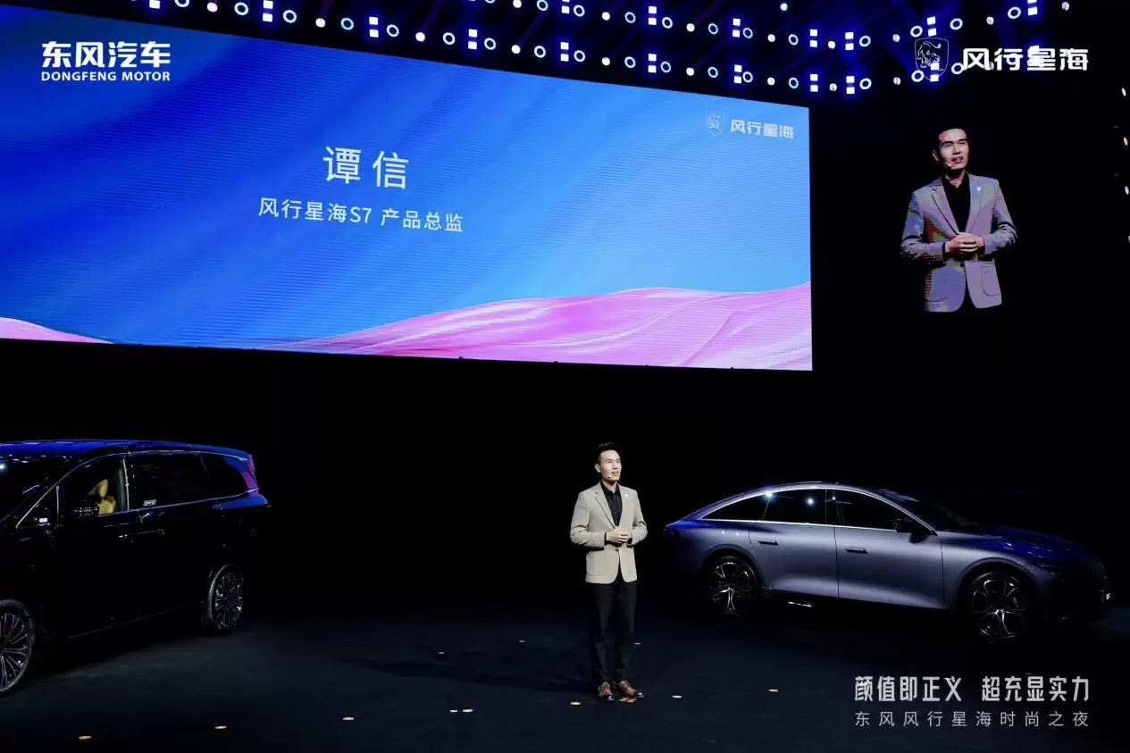 当晚的绝对主角——星海S7+800V超快充版,以“始于颜值,忠于实力”的综合表现成为全场焦点。设计上,新车延续“行云流水”的东方美学语言,塑造出风阻系数低至0.191Cd的流畅车身,并斩获三项全球设计大奖,被誉为“超模轿跑”。风行星海S7产品总监谭信形容:“静时如艺术品,动时即风景线。”这一设计理念在现场引发广泛共鸣。