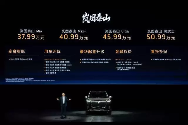 岚图汽车近日正式发布旗下大六座旗舰SUV——岚图泰山,价格区间为37.99万元至50.99万元,提供Max版、Max+版、Ultra版及黑武士版四款配置选择。为庆祝新车上市,品牌同步推出价值4.8万元的限时尊享权益,覆盖充电、保养等多项服务。