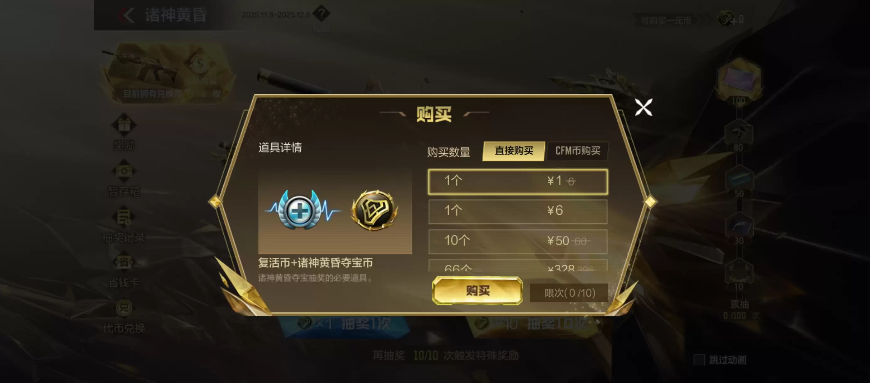 参与诸神黄昏夺宝活动前,玩家需要了解这个活动本质上是通过抽奖形式开展的。每次抽奖都需要消耗特定代币,单抽价格为6元,十连抽则需50元。目前部分商城还推出了一元代币的限时优惠,所以玩家在决定抽奖前,可以先考虑是否要购买代币。其实在游戏过程中,玩家完全可以通过完成日常任务免费获取代币。举个简单例子,比如CFM币商城的20连抽福利,这样的活动其实给了玩家低成本获取代币的机会。