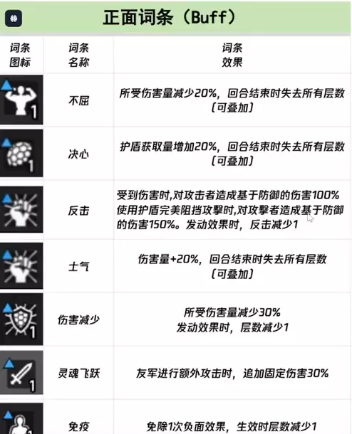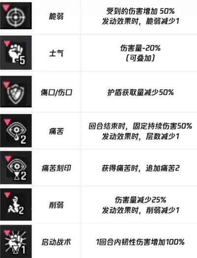 负面词条则是指减益效果,共包含5种属性。易伤类中的"脆弱"和"痛苦"属性,会让角色受到更多伤害,并附加持续性的固定伤害,对角色造成的打击相当显著。削弱士气类包括"士气"和"削弱"两种属性,它们能让角色的伤害量减少四分之一,不过在发动时效果层数会减少一层。护盾限制类主要以"损毁"属性为主,这个属性会使护盾的获取量降低50%。这样一来,护盾的防护效果就会大打折扣。