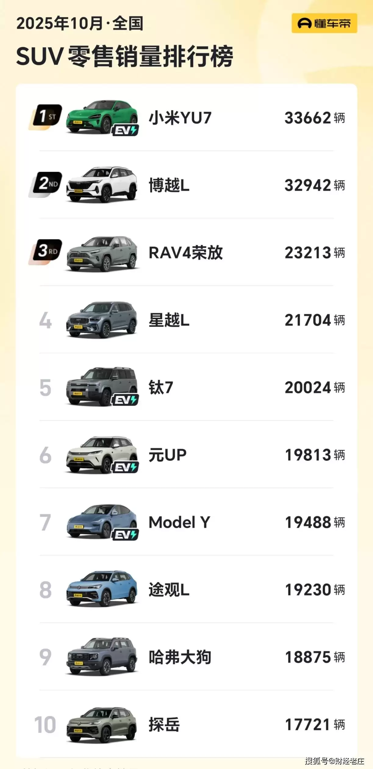 10月SUV销量出炉:小米YU7登顶,哈弗大狗再入前十