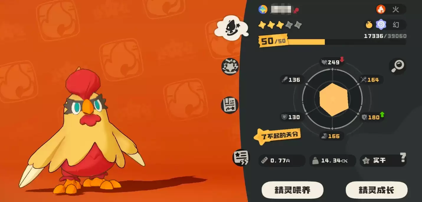 眩晕鸡属于火属性的精灵,说到火属性,其实单属性的精灵在后期并没有太大优势,尤其是可能会遇到属性被克制的问题,眩晕鸡当然也不例外。不过它的种族值为500,属于中规中矩的水平,虽然没有特别突出的强项,但也不至于太弱。属性分布相当均衡,既没有特别高的攻击力,也没有特别强的防御能力,整体是一只偏平衡型的精灵。或许有些玩家会觉得它的表现略显平淡,没有什么明显的短板,但同时也缺乏让人眼前一亮的优势。