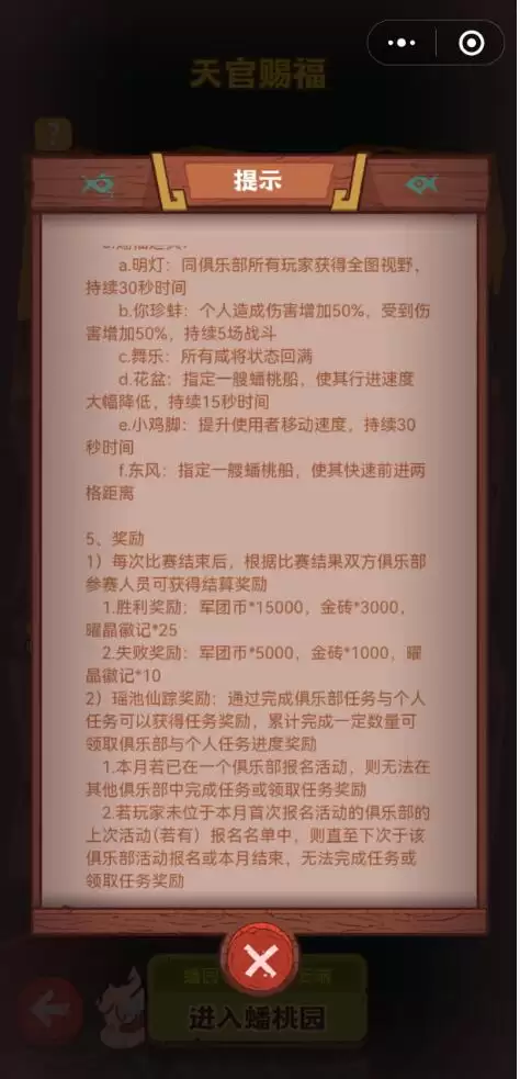 参与蟠桃园活动前,首先要掌握基本规则。俱乐部需要至少20名成员才能报名,并且要按照赛季要求提交对应数量的陆梦玲。另外要注意的是,活动时间固定在每月前三周周日的8:00~18:00。报名操作可以由俱乐部管理员统一处理,而实际比赛时长只有30分钟。具体对战安排在晚上8:00至8:30,系统会直接匹配两个俱乐部进行1v1实时对抗。玩家的目标就是夺取蟠桃船的控制权,并将其护送到终点。通过积累比赛积分,最终积分最高的俱乐部将赢得胜利。