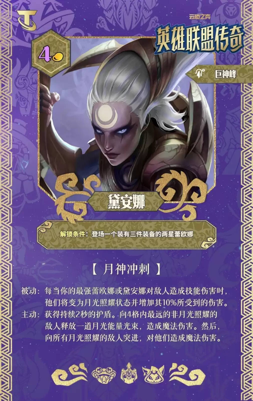 被动:当你最强的蕾欧娜或黛安娜对敌人造成技能伤害时,目标会进入月光照耀状态,并在持续期间额外承受10%的伤害。