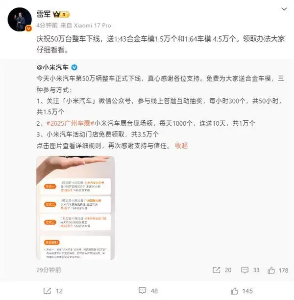 小米汽车50万辆下线刷新纪录,雷军宣布免费赠送6万套车模