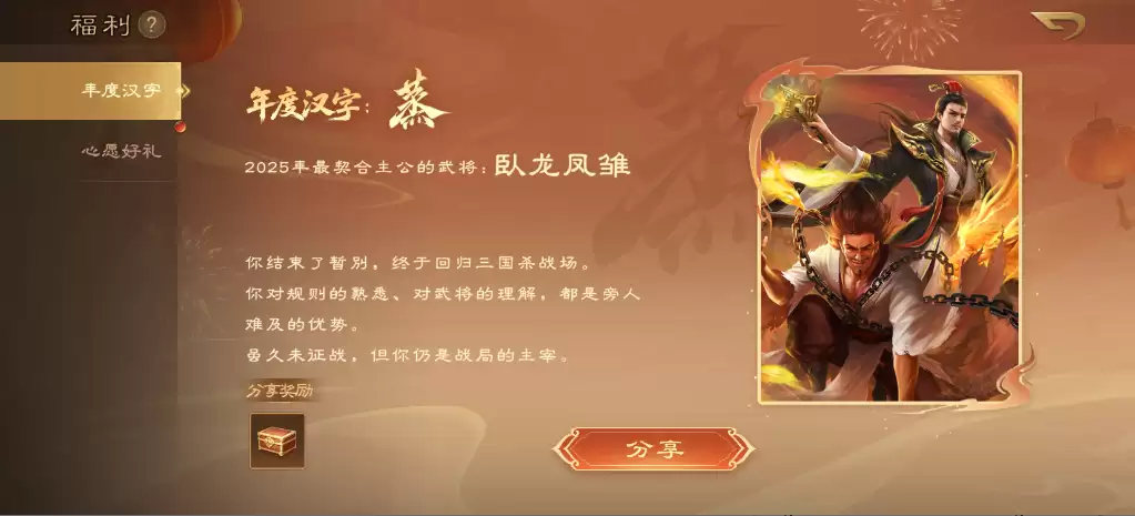 11月20日,《三国杀OL》周年盛典预约活动火热开启!即日起至12月5日登录游戏即可参与预约,领取海量惊喜好礼,点击卡面领取你的年度汉字,感受周年庆典的魅力时刻!盛典开启之时,更有诸多限时玩法即将上线,12月6日敬请期待!现在上抖音搜索"三国杀OL"打开同名小游戏,同样可以参与活动预约,12月6日即可领取神秘好礼。