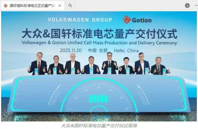 国轩高科与大众汽车集团的合作迎来里程碑时刻。11月20日,国轩高科在合肥举行标准电芯(Unified Cell,简称UC)量产交付仪式,标志着双方与大众旗下电芯制造商PowerCo历时五年的战略合作正式进入规模化量产阶段。根据协议,国轩高科将于2026年至2032年间向大众汽车集团持续供应高性能磷酸铁锂标准电芯及其他类型标准电芯。