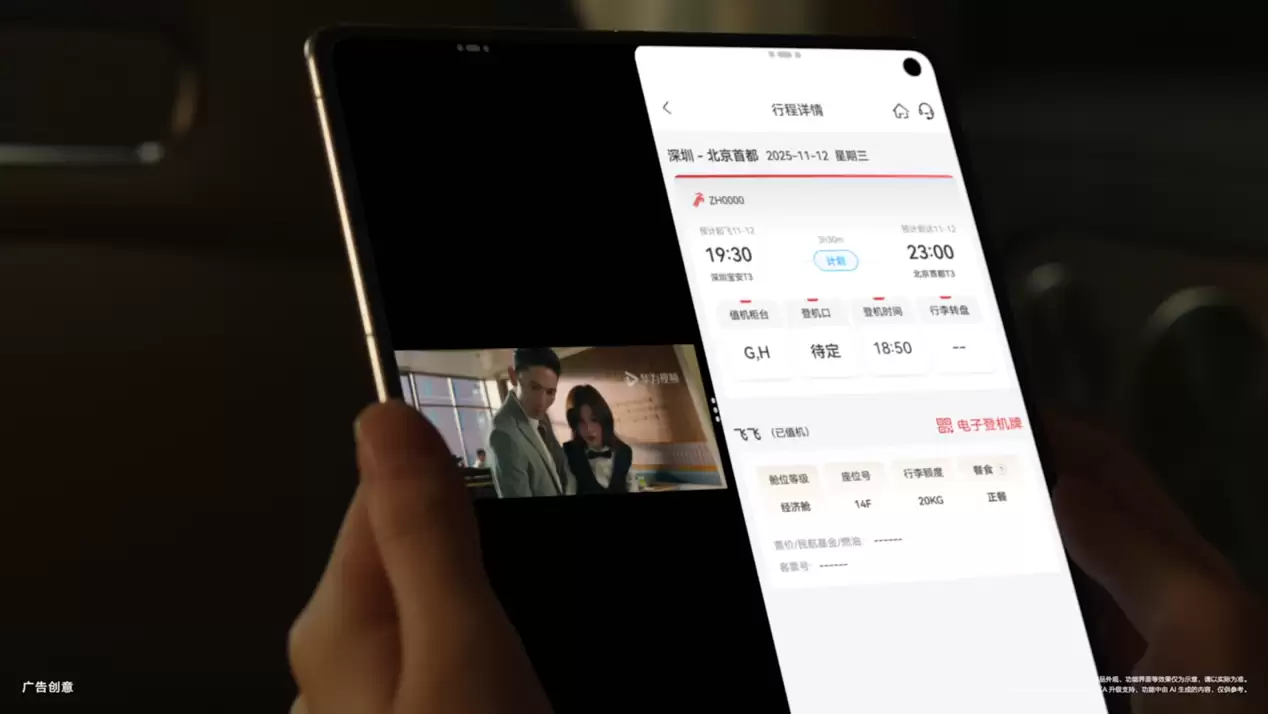 折叠大屏的形态创新,还为这些功能体验提供了最佳载体。在AI体验视频中展示的分屏场景,生动演绎了多任务处理的未来形态。华为Mate X7还深度适配了大屏布局,小艺智能体可以在大屏分屏呈现更丰富的信息,实现更高效的多任务处理,为用户带来前所未有的生产效率提升。