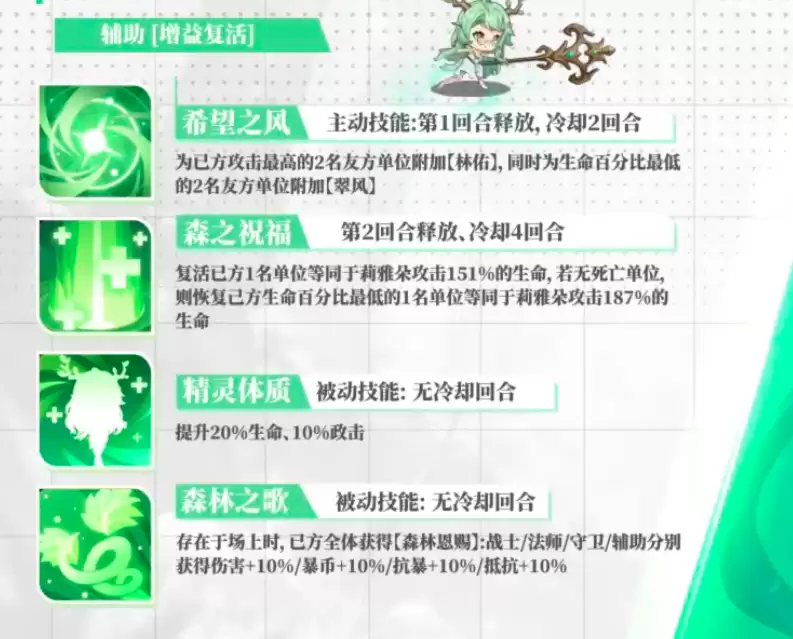 在技能配置方面,莉雅朵拥有一个主动技与三项被动技,分别是:主动技"希望之风",以及被动技"森之祝福"、"精灵体质"和"森林之歌"。其中"希望之风"将在首回合自动释放,冷却时间为两回合。发动后可为队内两名攻击力最高的成员附加"林佑"状态,降低其所受物理伤害;同时为血量百分比最低的两位队友施加"翠风"效果,实现30%生命值的快速回复,这是应对高强度战斗的核心手段。