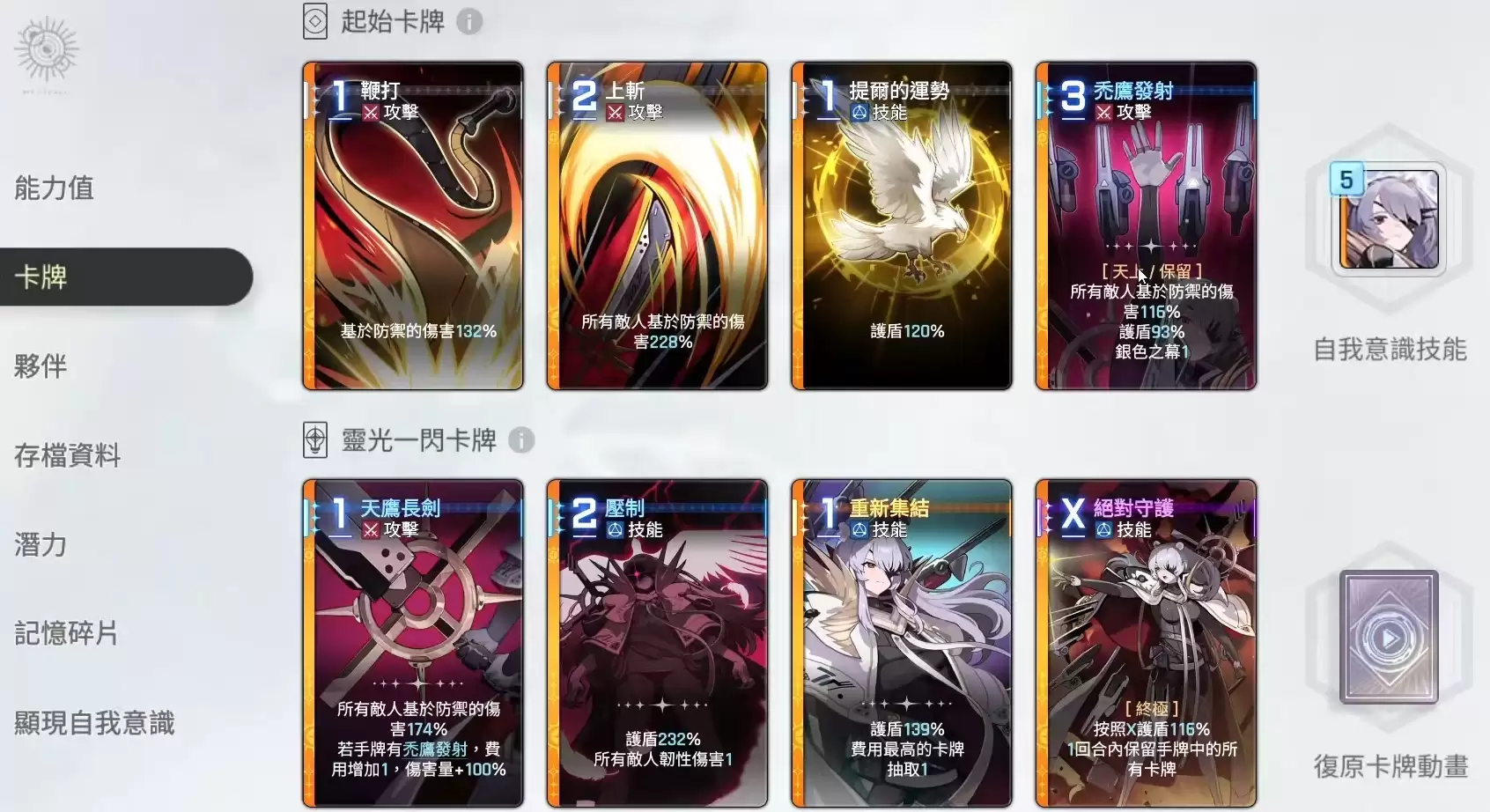 其余独特卡牌包括:“天鹰长剑”可对全体敌人造成150%防御伤害,若手牌中持有“秃鹰发射”,则此卡费用+1但伤害提升至300%,建议优先配合“秃鹰发射”打出以最大化收益;“压制”提供200%防御护盾并施加1点韧性削减;“重新集结”可在获得120%护盾的同时,抽取一张最高费用的手卡,增强后续回合调度能力;而“绝对守护”不仅提供高额护盾,还能保留当前所有手牌至下一回合,极大提升了策略灵活性和容错率。