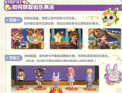 要想解锁这里的玩法,那就必须准备好通行证——也就是街乐果冻。这本就是备受大家喜爱的宝藏零食,其实它就藏在你每次的互动和挑战里。白天来到公告栏后就能找到古多曼,还能领取专属的交友任务。或者你也可以和陌生的旅人结伴而行,一起去完成小目标,把那些晶莹的果冻直接放进其中。如果你喜欢律动,不如直接去找阿菜报名,参加舞蹈大赛。不仅能收获快乐,还能赢得60个果冻,成就感十足。