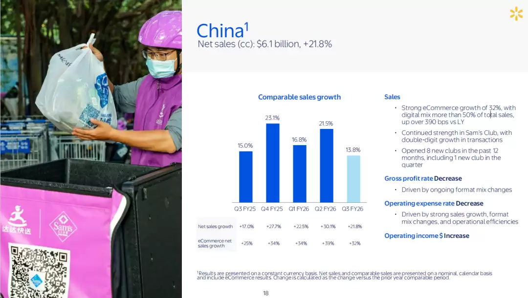 会员业务构成沃尔玛在华增长的另一大驱动力。第三季度,公司会员费收入同比增长16.7%,其中国际业务增幅高达34%,主要受益于中国山姆会员数量的显著提升。沃尔玛首席财务官John David Rainey在财报会议上特别指出:“中国销售额22%的增长,既体现了山姆会员店的持续强势表现,也反映了电商业务超过30%的增速。”公司总裁兼首席执行官董明伦进一步强调,中国市场的数字零售渗透率已达50%,近80%的数字订单可在1小时内送达,其运营效率“领先于我们所有海外市场”。