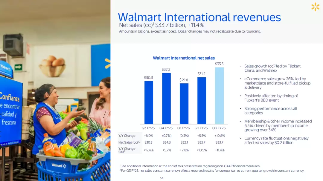 沃尔玛最新公布的2026财年第三季度财报显示,截至2025年10月31日的三个月内,公司全球营收达1795亿美元,同比增长5.8%,按固定汇率计算增幅为6.0%。尽管营业利润因印度数字支付公司PhonePe计提潜在IPO非现金股权激励费用而微降0.2%,但经调整后营业利润仍实现8.0%的增长,调整后每股收益为0.62美元。全球电商业务表现尤为亮眼,销售额同比大增27%,成为拉动整体增长的核心引擎。