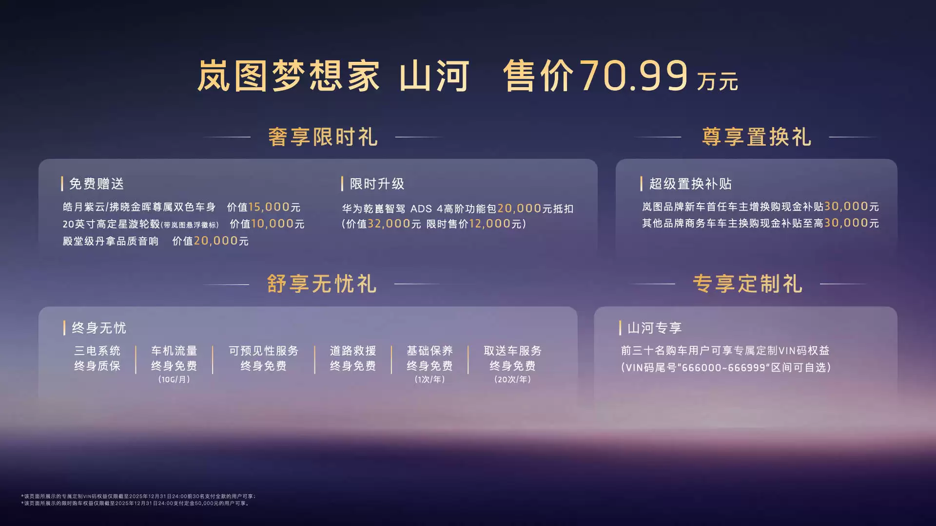 在广州车展的璀璨舞台上,一款名为岚图梦想家山河的“新时代旗舰四座MPV”震撼登场,以70.99万元的售价正式开启市场征程。这款新车不仅带来了专属的四重礼遇,包括皓月紫云与拂晓金辉两款尊属双色车身、20英寸高定星漩轮毂(配备岚图悬浮徽标)、殿堂级丹拿音响,还涵盖了华为乾崑智驾ADS 4高阶功能包现金抵扣、超级置换补贴、专属定制VIN码权益,以及三电系统终身质保、车机流量终身免费、道路救援终身免费等一系列丰厚权益,彰显了其高端定位与满满诚意。