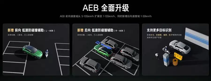 核心升级围绕AEB防碰撞系统展开,新增了前向低速防碰撞辅助(LAEB)与后向低速防碰撞辅助(RAEB)功能。当车辆以1-10km/h低速前行或以1-30km/h倒车时,系统可实时监测行人、车辆及二轮车等动态目标。一旦检测到碰撞风险且驾驶员未及时反应,系统将自动触发预警并实施制动。此次更新使AEB系统的工作速度范围从原有的5-135km/h扩展至前向1-135km/h、后向1-30km/h,同时新增了对墙壁、立柱等静态障碍物的识别能力,显著提升了复杂环境下的防护效能。