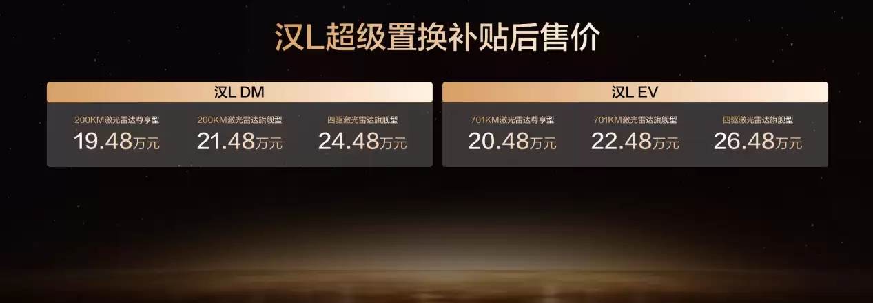 比亚迪近期的重磅产品——全新旗舰轿车汉L正式发布。这款车型凭借其三电技术的重大突破、创新的车身色彩设计以及全方位的智能化升级,为新能源高端轿车市场树立了全新标杆。此次发布的汉L包括纯电动版(EV)与插电混动版(DM)两大动力系列,共推出6款配置车型,补贴后售价区间为19.48万元至26.48万元。同时,官方还推出限时购车权益,最高可享5.2万元的综合优惠。