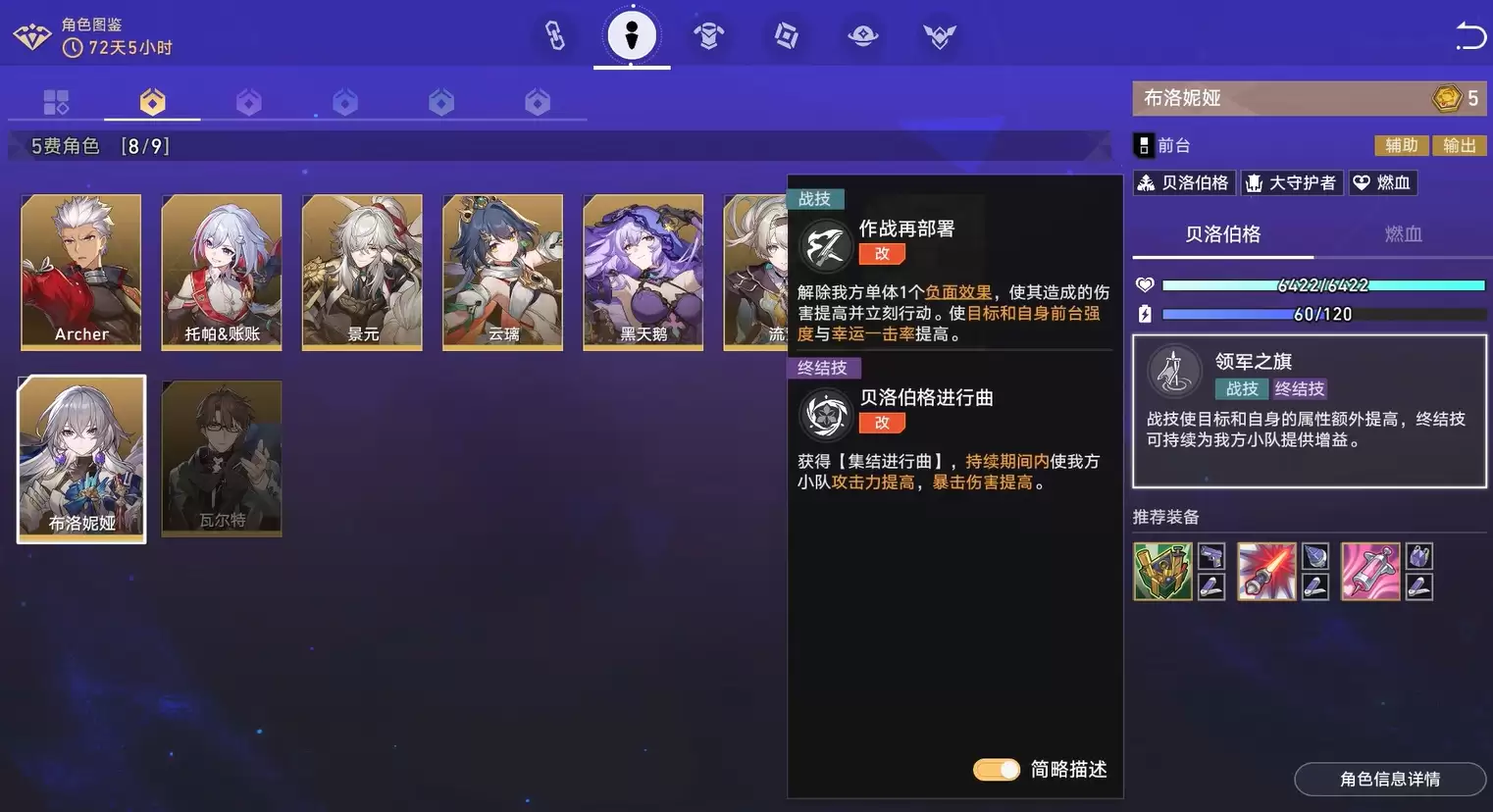 她能召唤可可利亚来协助队伍输出,在队伍主C伤害不足时,可以提供不错的兜底伤害。而且在二星后甚至可以将她视为队伍中的主C,是一位强度相当不错的五费角色。即便玩家没办法将布洛妮娅追到两星以上,一星的布洛妮娅依然拥有极强的辅助能力,可大幅提升整队所造成的伤害。