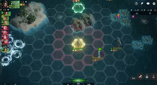随后在旋转动画结束后就会进入战斗界面,这是典型的回合制海战。玩家需要把握三个要点:行动顺序、攻击目标以及地图格子。行动顺序主要看舰队的机动能力,屏幕上方会显示本回合及下回合的出手顺序。提前了解谁先出手,就能做好战术规划。战斗地图采用六边形格子,蓝色细边框代表可移动区域,红色细边框则是攻击范围。点击格子后还能预览移动和攻击路径,完全不用担心操作失误。