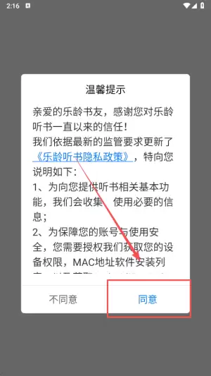 1、点击界面上的“同意”按钮,即可顺利进入应用,开启您的阅读之旅。