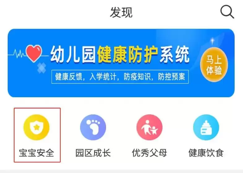 进入"发现"对话框后,界面下方设有四个内容板块:宝宝安全、园区成长、优秀父母、健康饮食,我们可以选择任意板块进行阅读学习。这里我们选择"宝宝安全"板块;