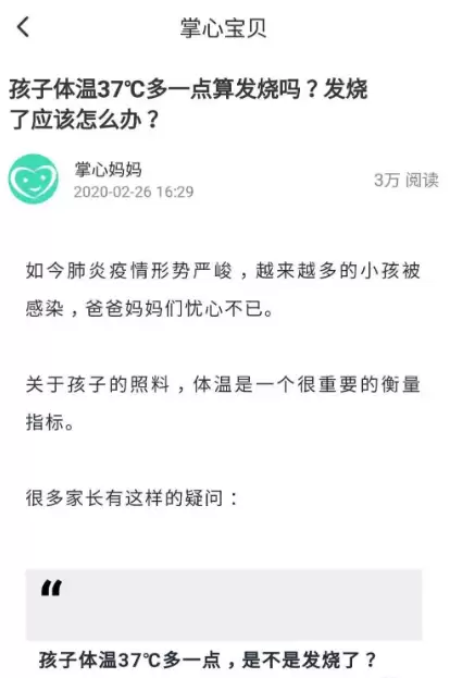 "宝宝安全"板块主要提供关于儿童常见疾病的预防知识和应对建议。我们选择第二篇文章《孩子体温37℃算发烧吗?发烧了应该怎么办?》,点击进入阅读;