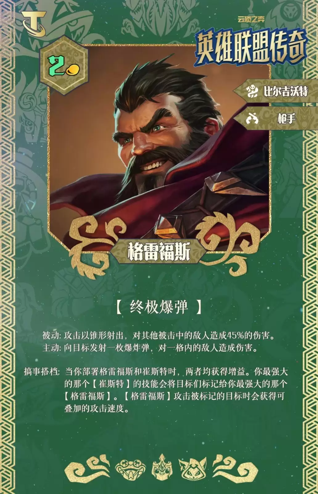搞事搭档:当你同时部署格雷福斯和崔斯特时,两者都将获得特殊增益。你场上最强的【崔斯特】会标记目标,使其与你场上最强的【格雷福斯】产生联动。当【格雷福斯】攻击被标记的目标时,会获得可叠加的攻击速度加成。