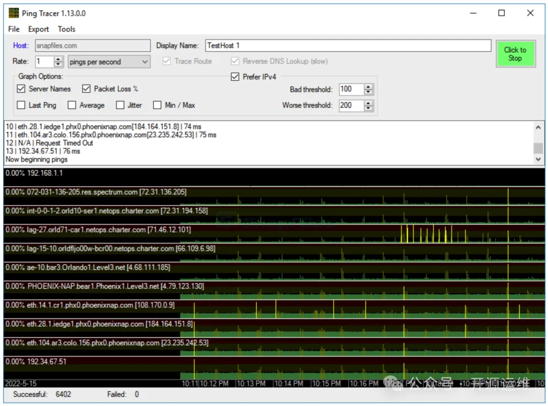 程序启动时会先进行一次路由跟踪,找出从你到目标之间的所有“站点”。不过它也有自己的小脾气,比如为了不影响速度,每个主机它只尝试联系一次。如果连续 5 个主机都没能响应,它就认为已经走过头了。另外,有些主机在路由跟踪时会应答,但单独 ping 它却装死。几秒钟后,Ping Tracer 就会把这种不老实的主机从监控列表里剔除。