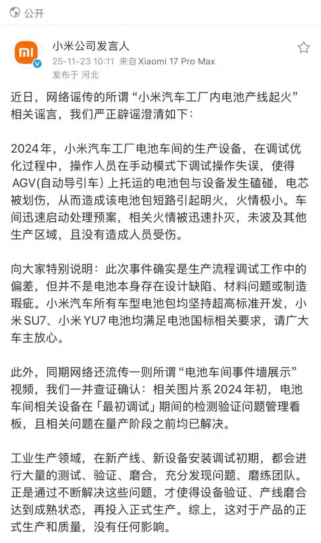 小米公司强调,此次事件属于生产流程调试阶段的正常偏差,并非电池设计、材料或制造环节存在缺陷。目前小米汽车全系车型的电池包均按照行业最高标准开发,其中小米SU7与小米YU7的电池均已通过国家强制性标准认证,用户可放心使用。针对同期流传的“电池车间事件墙展示”视频,经核查确认,相关画面为2024年初设备调试阶段的检测验证问题管理看板记录,所有问题已在量产前完成整改。