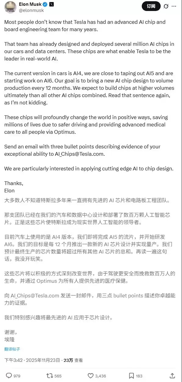 11月24日,据IT之家报道,特斯拉CEO埃隆·马斯克于11月23日在社交平台发文,首次系统性阐述了其自研AI芯片团队的长远规划与发展目标。